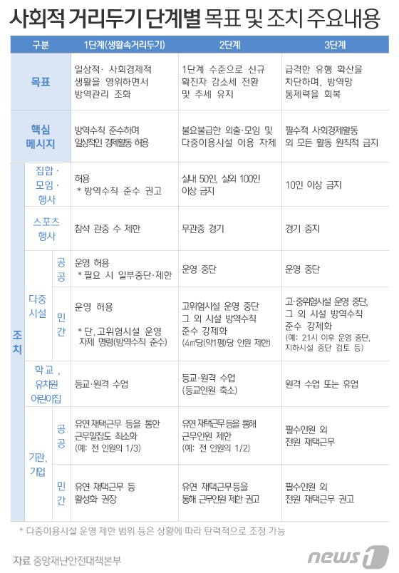 또한 현재는 무관중 경기로 진행되고 있는 스포츠경기도 경기가 전면 중단된다. 1일 중앙재난안전대책본부(중대본)에 따르면 기존 3단계이던 거리두기가 앞으로는 1단계(생활방역) 1.5단계(지역유행 개시) 2단계(지역유행 급속전파 및 전국적 확산 개시) 2.5단계(전국적 유행 본격화) 3단계(전국적 대유행) 등 5단계로 구분된다. 자발적 참여를 독려하지만 사실상 의무적으로 이행해야 하는 조치이며, 단계별로 1단계, 1.5단계, 2단계, 2.5단계, 3단계로 나뉘게 됩니다. 통상적인 방역 및 의료체계의 감당 가능한 범위. 📌유흥시설, 콜라텍, 홀덤펍, 노래연습장, 식당, 카페 등은 밤 10시부터 다음날 오전 5시까지 영업이 제한.